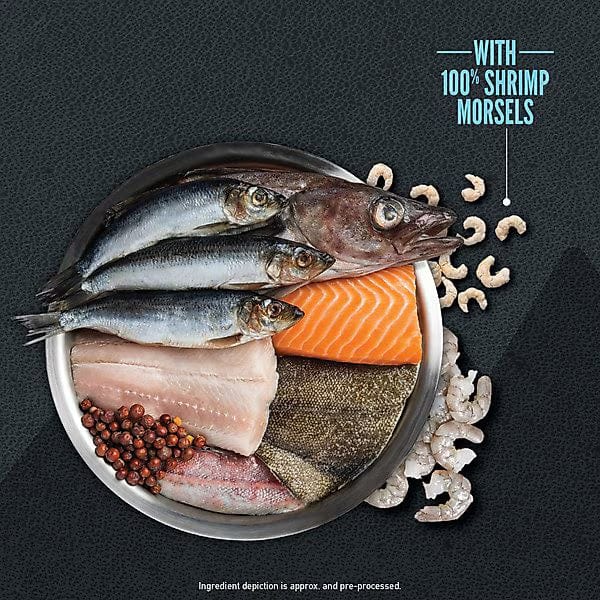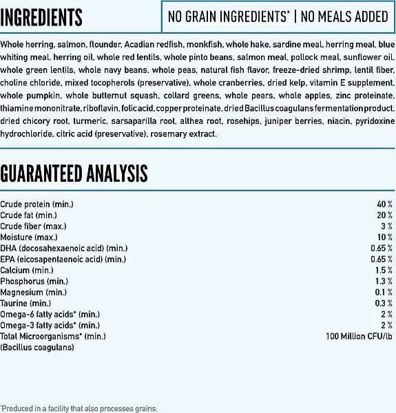 Whole Herring, Salmon, Flounder, Acadian Redfish, Monkfish, Whole Hake, Sardine Meal, Herring Meal, Blue Whiting Meal, Herring Oil, Whole Red Lentils, Whole Pinto Beans, Salmon Meal, Pollock Meal, Sunflower Oil, Whole Green Lentils, Whole Navy Beans, Whole Peas, Natural Fish Flavor, Whole Freeze Dried Shrimp, Lentil Fiber, Choline Chloride, Mixed Tocopherols (Preservative), Whole Cranberries, Dried Kelp, Vitamin E Supplement, Whole Pumpkin, Whole Butternut Squash, Collard Greens, Whole Pears, Whole Apples, Zinc Proteinate, Thiamine Mononitrate, Riboflavin, Folic Acid, Copper Proteinate, Dried Bacillus Coagulans Fermentation Product, Dried Chicory Root, Turmeric, Sarsaparilla Root, Althea Root, Rosehips, Juniper Berries, Niacin, Pyridoxine Hydrochloride, Citric Acid (Preservative), Rosemary Extract.