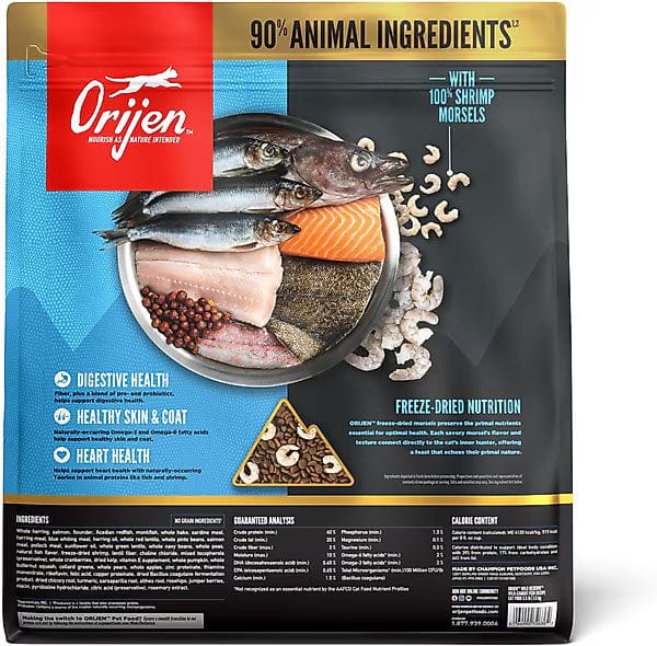 Satisfy your feline’s natural instincts with ORIJEN Wild Reserve Wild-Caught Fish Recipe Dry Cat Food. This unique recipe combines the nourishing ingredients of ORIJEN with 100% freeze-dried shrimp morsels for a truly wild and protein-packed meal. These morsels are packed with flavor and nutrition, appealing to your cat’s primal need to bite, tear, and consume animal ingredients. Made with wholeprey animal ingredients and no fillers, this recipe provides your cat with the essential nutrients they need to thrive in their natural state.