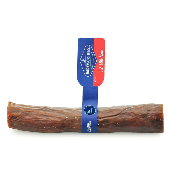 Barkworthies Stuffed Snackle Beef Esophagus is an all natural, highly digestible dog chew sourced from free range, grass-fed cattle for delicious treat your dog will love! Each Esophagus is stuffed with irresistible beef pizzle for ultimate flavor!
