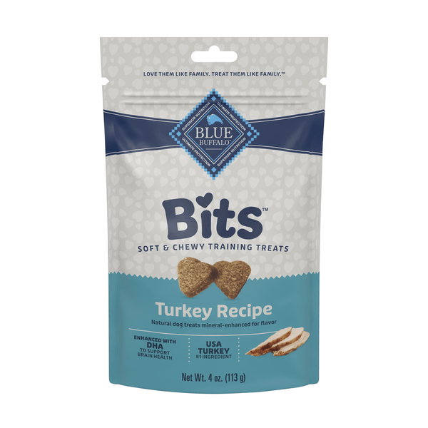 Blue Buffalo Blue Bits Tempting Turkey Recipe Soft-Moist Training Dog Treats are natural dog treats that are optimally-sized for repeat rewards. Perfect for training and treating your furry friend, Blue Bits are a healthy and nutritious reward that your pup will love. Each meaty morsel is crafted with real turkey as the first ingredient for protein and contains no by-product meals. Added DHA for cognitive support and omega-3 and omega-6 fatty acids for skin and coat health make this a healthy treat you can feel good about giving your dog.