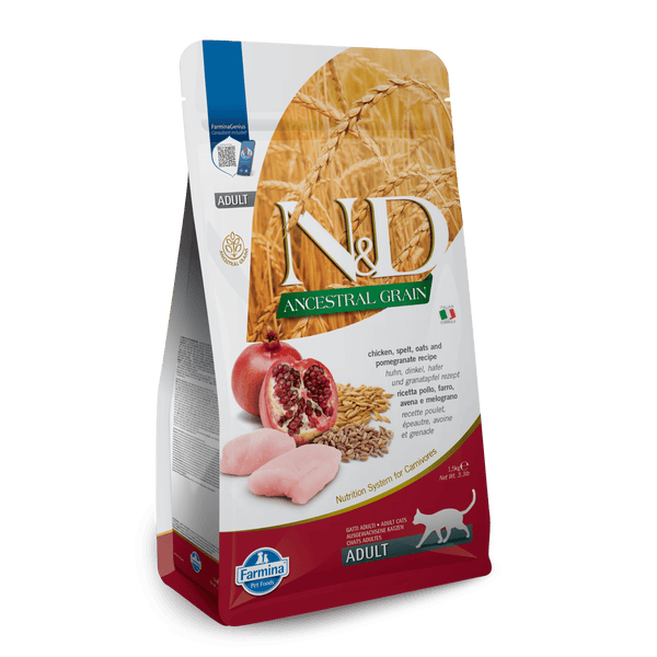 N&D Chicken, spelt, oats and pomegranate recipe is formulated to meet the nutritional levels established by the AAFCO Cat Food Nutrient Profiles for maintenance.