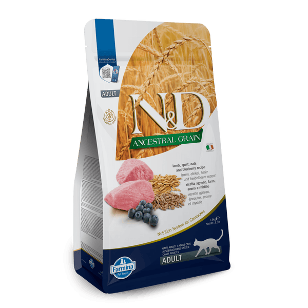 N&D Lamb, spelt, oats and blueberry recipe.is formulated to meet the nutritional levels established by the AAFCO Cat Food Nutrient Profiles for maintenance.