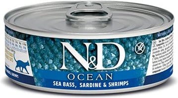 N&D Ocean Cat Sea Bass, Sardine & Shrimp Recipe is formulated to meet the nutritional levels established by the AAFCO Cat Food Nutrient Profiles for maintenance.