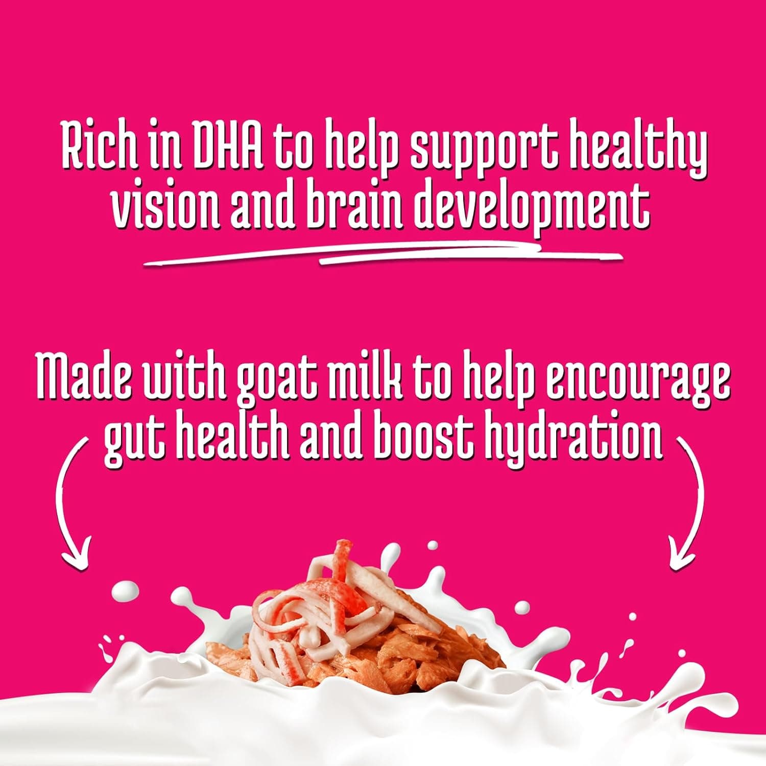 Tuna, Water Sufficient for Processing, Ocean Fish, Goat Milk, Sunflower Seed Oil, Tapioca Starch, Tricalcium Phosphate, Calcium Carbonate, Xanthan Gum, Choline Chloride, Taurine, Frutooligosaccharide, Guar Gum, Zinc Sulfate, Vitamin E Supplement, Thiamine Mononitrate, Nicotinic Acid, Calcium Pantothenate, Vitamin A Supplement, Manganese Sulfate, Ferrous Sulfate, Copper Sulfate, Riboflavin Supplement, Pyridoxine Hydrochoride, Folic Acid, Potassium Iodide, Menadione Sodium Bisulfite Complex, Vitamin B12 Supplement.