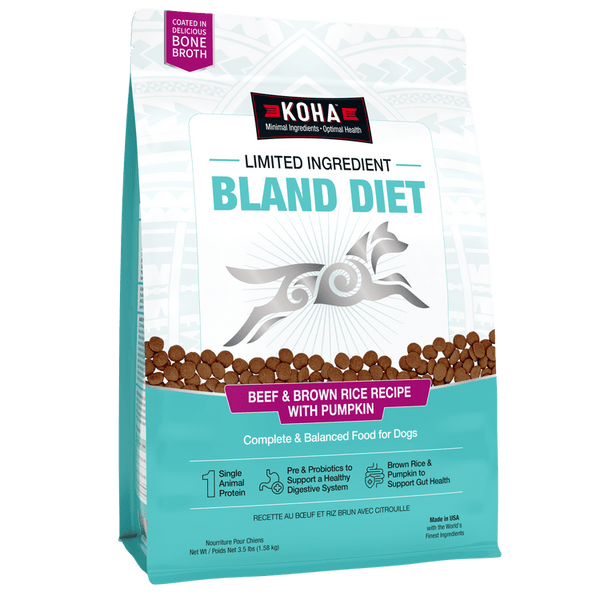 KOHA Limited Ingredient Bland Diet Dry Food is a gentle recipe created with sensitive tummies in mind. This highly digestible dog food has all the benefits of a bland diet, that is convenient, complete and balanced, and ready-to-serve! KOHA Bland Diet is a limited ingredient dog food, which means we use only one animal protein per recipe to minimize the risk of food allergies. This sensitive stomach food for dogs is made with chicken/beef, rice, and pumpkin to support healthy stools and regularity. It's free from junky fillers like potatoes, corn, soy, animal by-products, or artificial flavors or preservatives that can cause digestive upset. And every bite is coated with delicious bone broth, which gives an irresistible taste that dogs love!