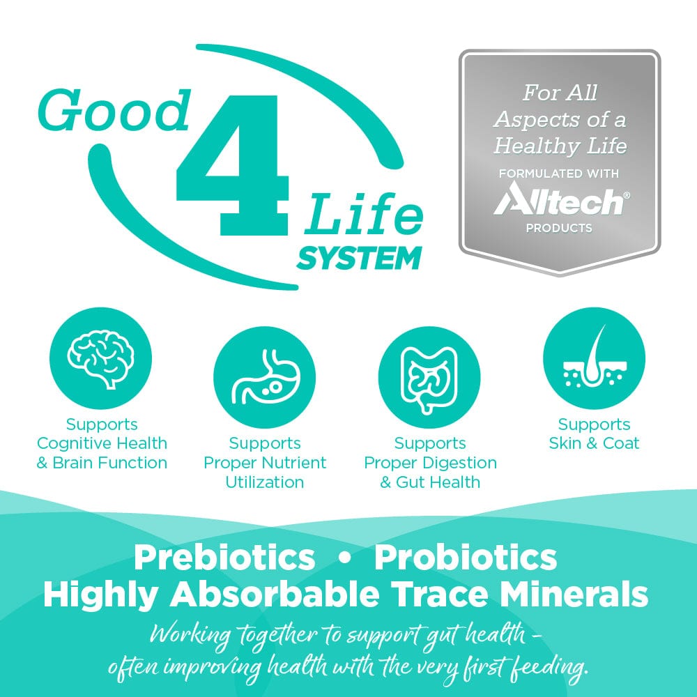 - Our exclusive Good 4 Life ingredients promote gut health and overall well-being for pets.