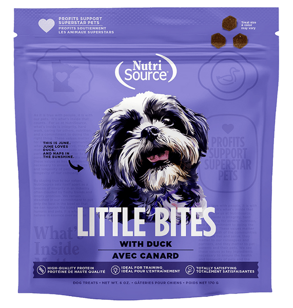 NutriSource Duck Little Bites are made with high-quality protein. Real foods that dogs love in a treat make these totally satisfying!