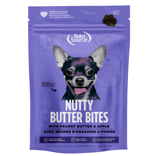 - NutriSource Peanut Butter & Apple Nutty Butter Bites are made with high-quality plant protein.