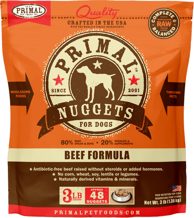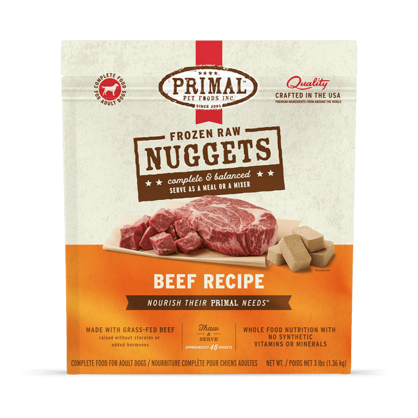 Nourish your dog’s primal needs with complete and balanced raw dog food. Our Beef Recipe raw dog food features grass-fed beef raised without steroids or added hormones.