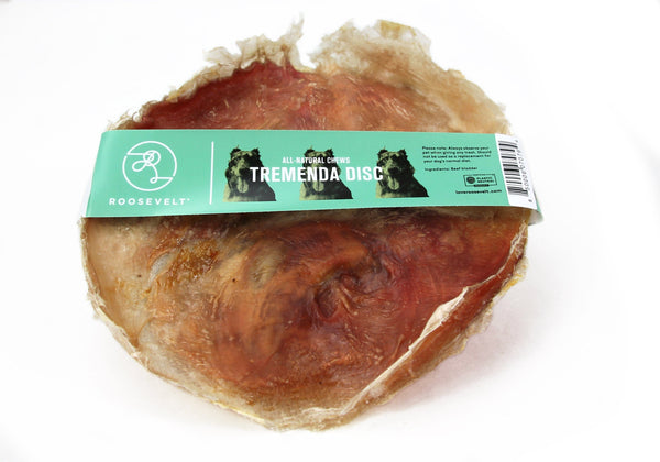 Roosevelt Tremenda Disc are a single ingredient chews sourced from free-range and grassfed bulls to create a high quality and tasty chew. This is for dogs that tend to chow down whole treats all at once. The tremenda is stretched into a disc, making it difficult to swallow and longer lasting to chew. This highly palatable chew is a favorite of all types of dogs.