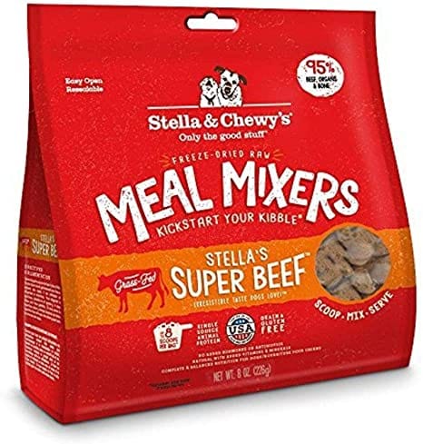 Kickstart Your Kibble! Dogs naturally crave meat, much like they ate in the wild. That's why every batch of Stella's Super Beef Meal Mixers starts with 95% beef (always grass-fed!), organs and bone plus 100% organic certified fruits and vegetables to guarantee your pet is eating as nature intended. Every recipe from Stella & Chewy's is grain-free and minimally processed. All ingredients are sustainably sourced, and NEVER from China. Add a scoop to your dog's kibble for a boost of real freeze-dried raw food nutrition and tasteWhy We Love It