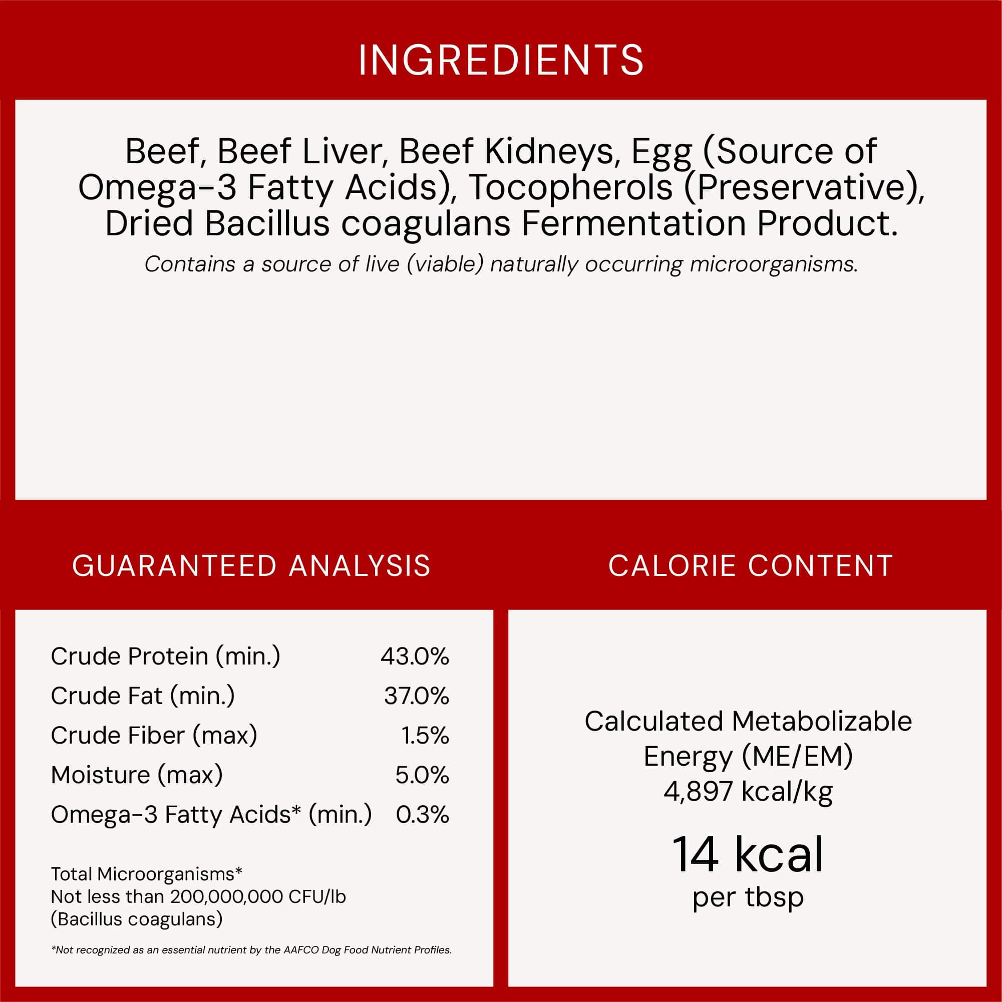 Beef, Beef Liver, Beef Kidneys, Egg (Source of Omega-3 Fatty Acids), Tocopherols (Preservative), Dried Bacillus Coagulans Fermentation Product.