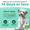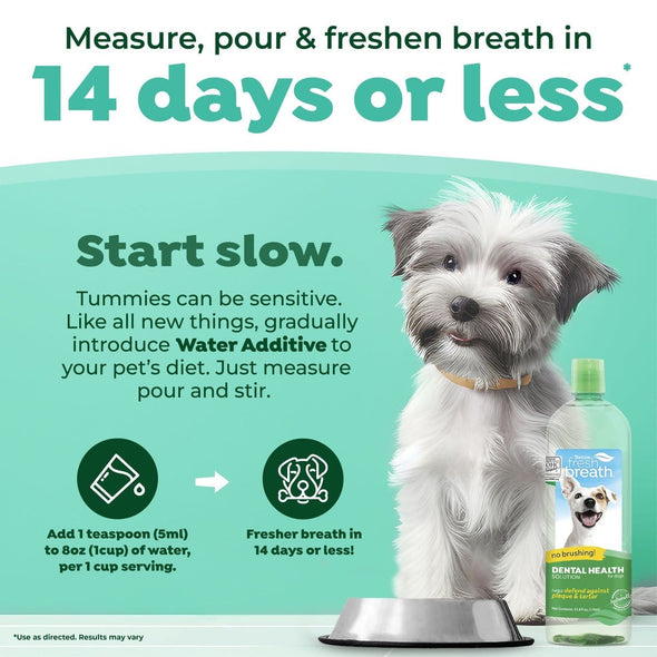 - If your pup is new to Fresh Breath for Dogs or has a sensitive stomach, you can start with half the recommended dose to help him acclimate.