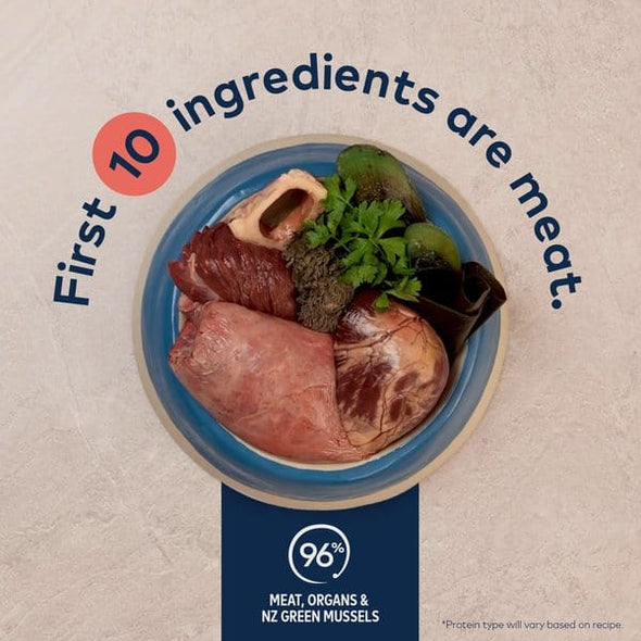 - Safely air-dried and ready to serve, this single-protein recipe contains whole-prey ratios of 96% meat, organs, bone and New Zealand green mussels.