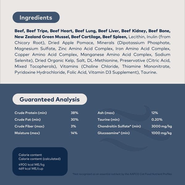 Beef, Beef Tripe, Beef Heart, Beef Lung, Beef Liver, Beef Kidney, Beef Bone, New Zealand Green Mussel, Beef Cartilage, Beef Spleen, Lecithin, Inulin (from Chicory Root), Dried Apple Pomace, Minerals (Dipotassium Phosphate, Magnesium Sulfate, Zinc Amino Acid Complex, Iron Amino Acid Complex, Copper Amino Acid Complex, Manganese Amino Acid Complex, Sodium Selenite), Dried Organic Kelp, Salt, DL-Methionine, Preservative (Citric Acid, Mixed Tocopherols), Vitamins (Choline Chloride, Thiamine Mononitrate, Pyridoxine Hydrochloride, Folic Acid, Vitamin D3 Supplement), Taurine.