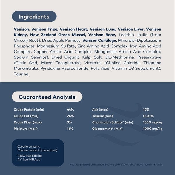 Venison, Venison Tripe, Venison Heart, Venison Lung, Venison Liver, Venison Kidney, New Zealand Green Mussel, Venison Bone, Lecithin, Inulin (from Chicory Root), Dried Apple Pomace, Venison Cartilage, Minerals (Dipotassium Phosphate, Magnesium Sulfate, Zinc Amino Acid Complex, Iron Amino Acid Complex, Copper Amino Acid Complex, Manganese Amino Acid Complex, Sodium Selenite), Dried Organic Kelp, Salt, DL-Methionine, Preservative (Citric Acid, Mixed Tocopherols), Vitamins (Choline Chloride, Thiamine Mononitrate, Pyridoxine Hydrochloride, Folic Acid, Vitamin D3 Supplement), Taurine.