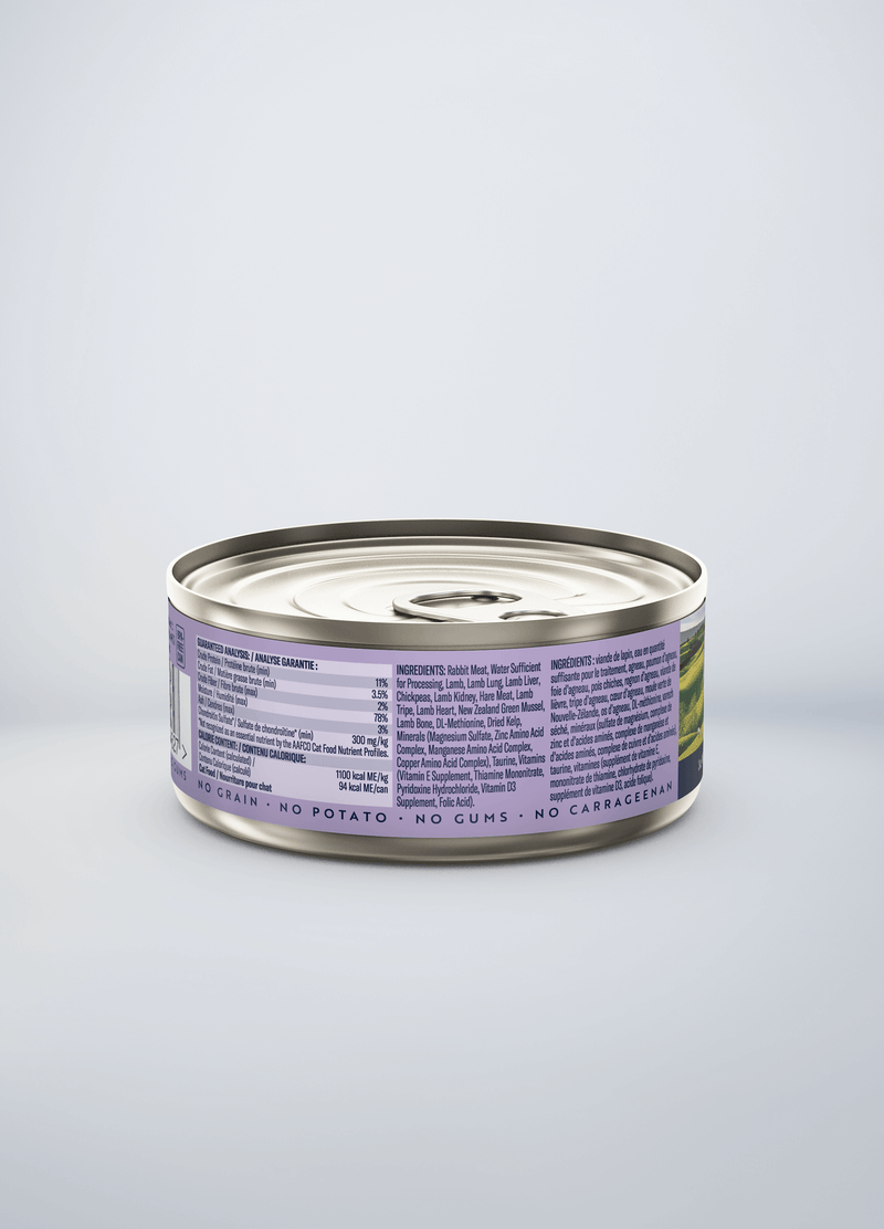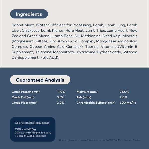 Rabbit Meat, Water Sufficient for Processing, Lamb, Lamb Lung, Lamb Liver, Chickpeas, Lamb Kidney, Hare Meat, Lamb Tripe, Lamb Heart, New Zealand Green Mussel, Lamb Bone, DL-Methionine, Dried Kelp, Minerals (Magnesium Sulfate, Zinc Amino Acid Complex, Manganese Amino Acid Complex, Copper Amino Acid Complex), Taurine, Vitamins (Vitamin E Supplement, Thiamine Mononitrate, Pyridoxine Hydrochloride, Vitamin D3 Supplement, Folic Acid).